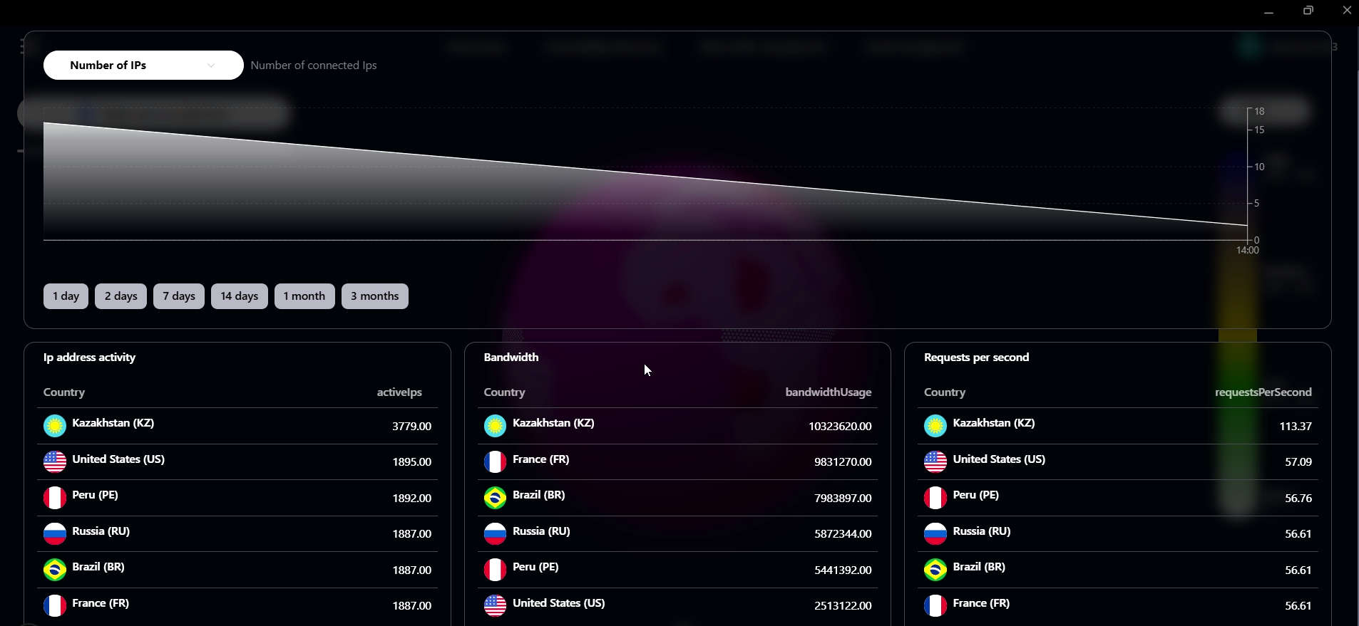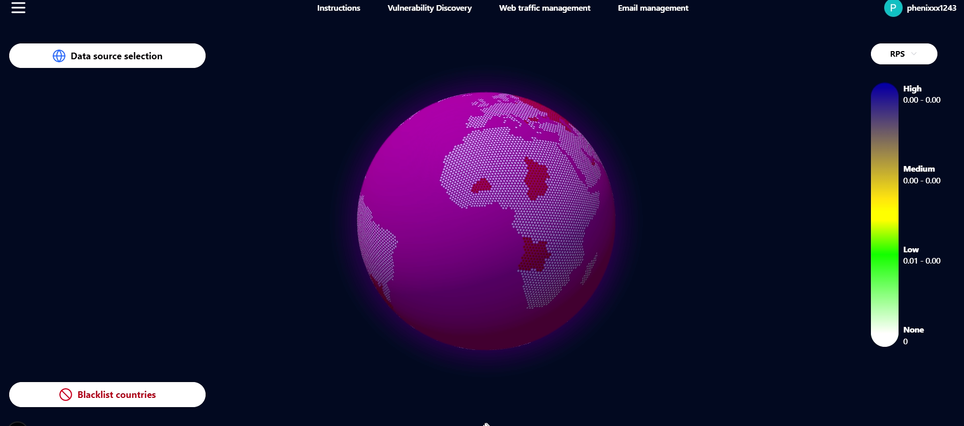 The interactive 3D globe displays traffic by requests, users, and volume, with variation history.