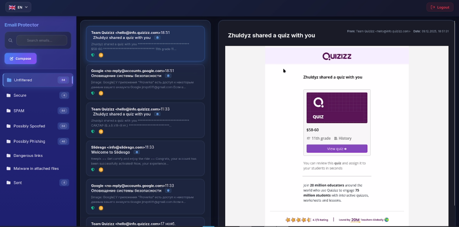 - 5 layered, AI-powered threat protection with automatic email categorization (Secure, Spam, Dangerous Links, Phishing, Spoofed)